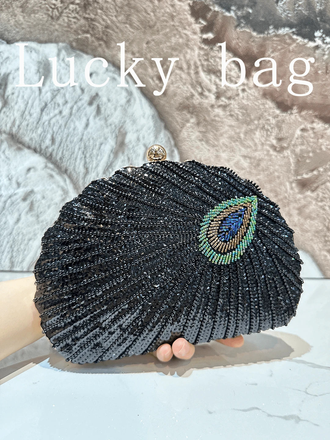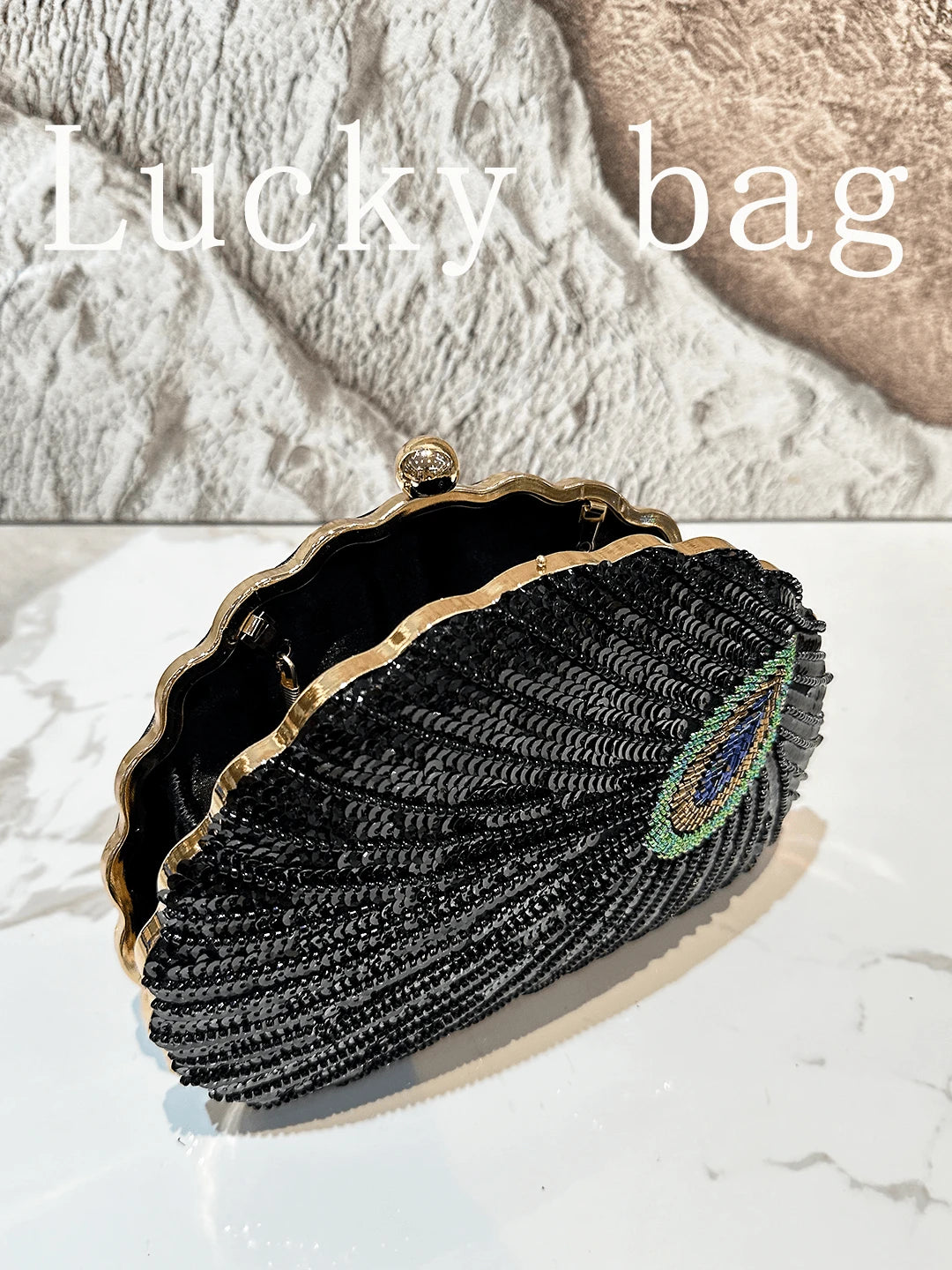 Peacock Blue Vintage Cheongsam Clutch – Sequin Birds Pattern, Elegant Evening Bag for Weddings, Parties & Formal Events-Black