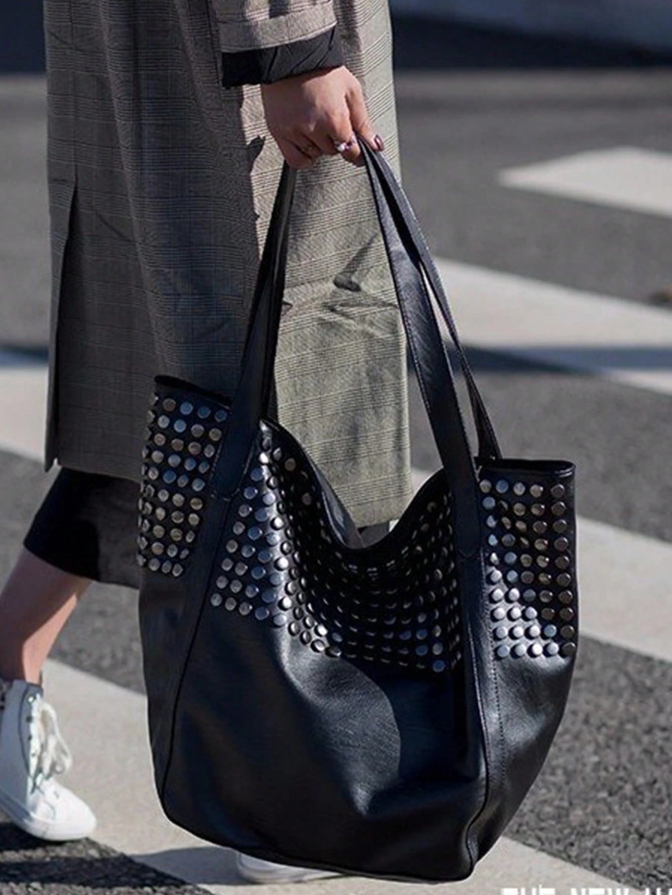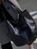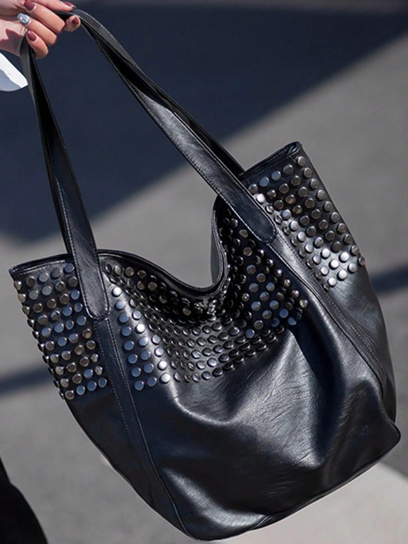 Soft Leather Tote Bag – Large Capacity, Rivet Design, Leopard Print-Black
