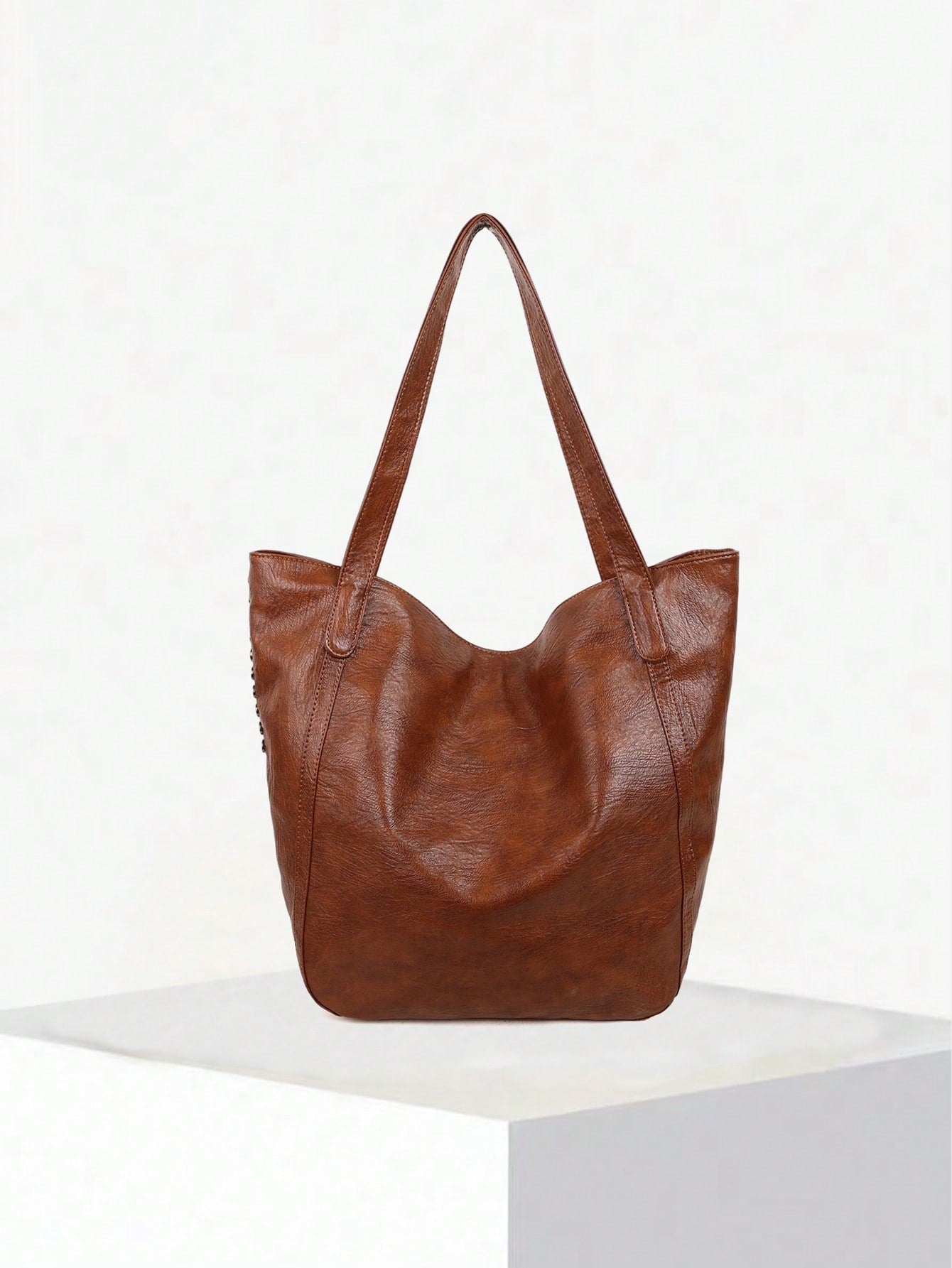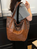 Soft Leather Tote Bag – Large Capacity, Rivet Design, Leopard Print-Brown