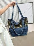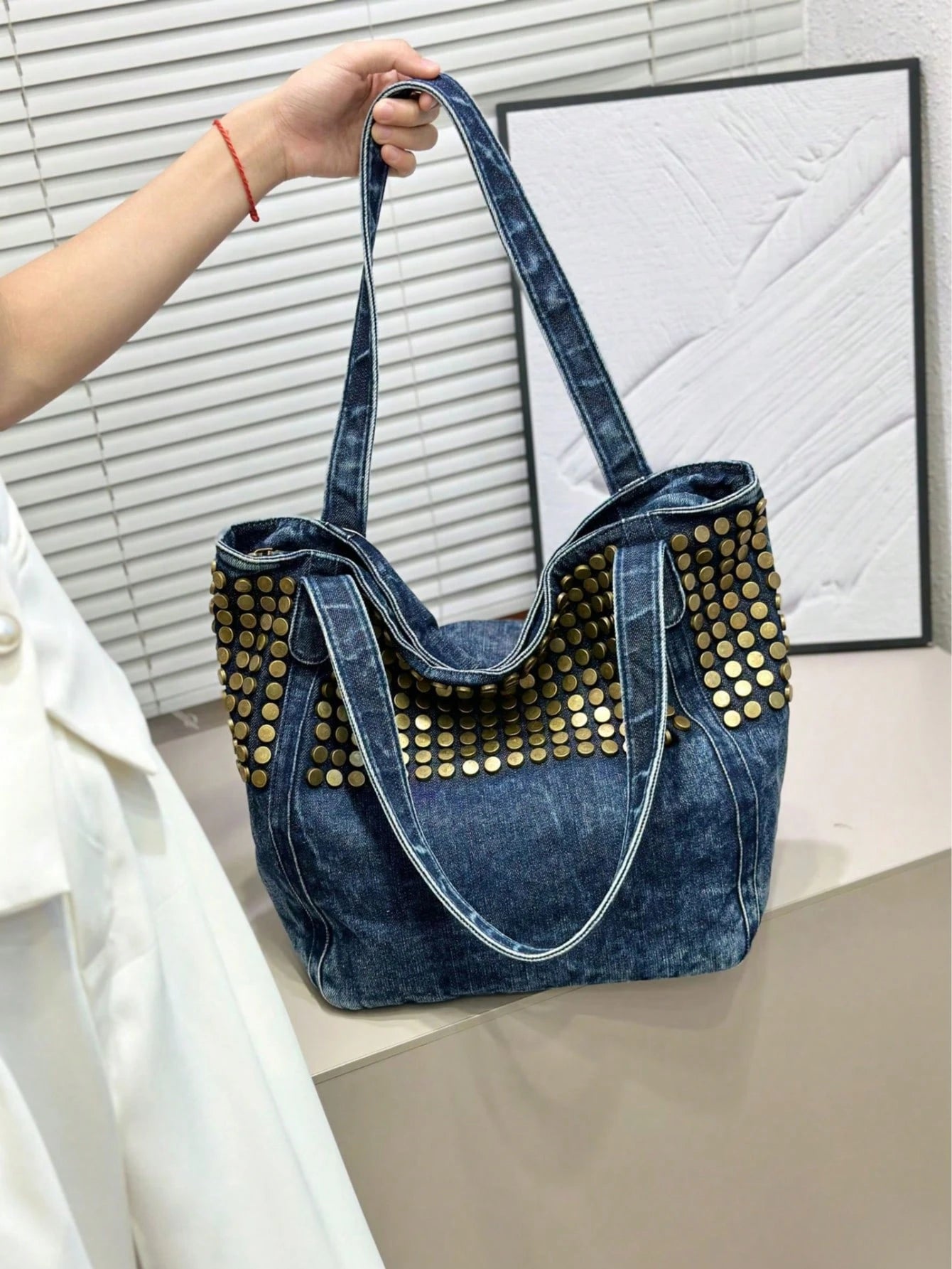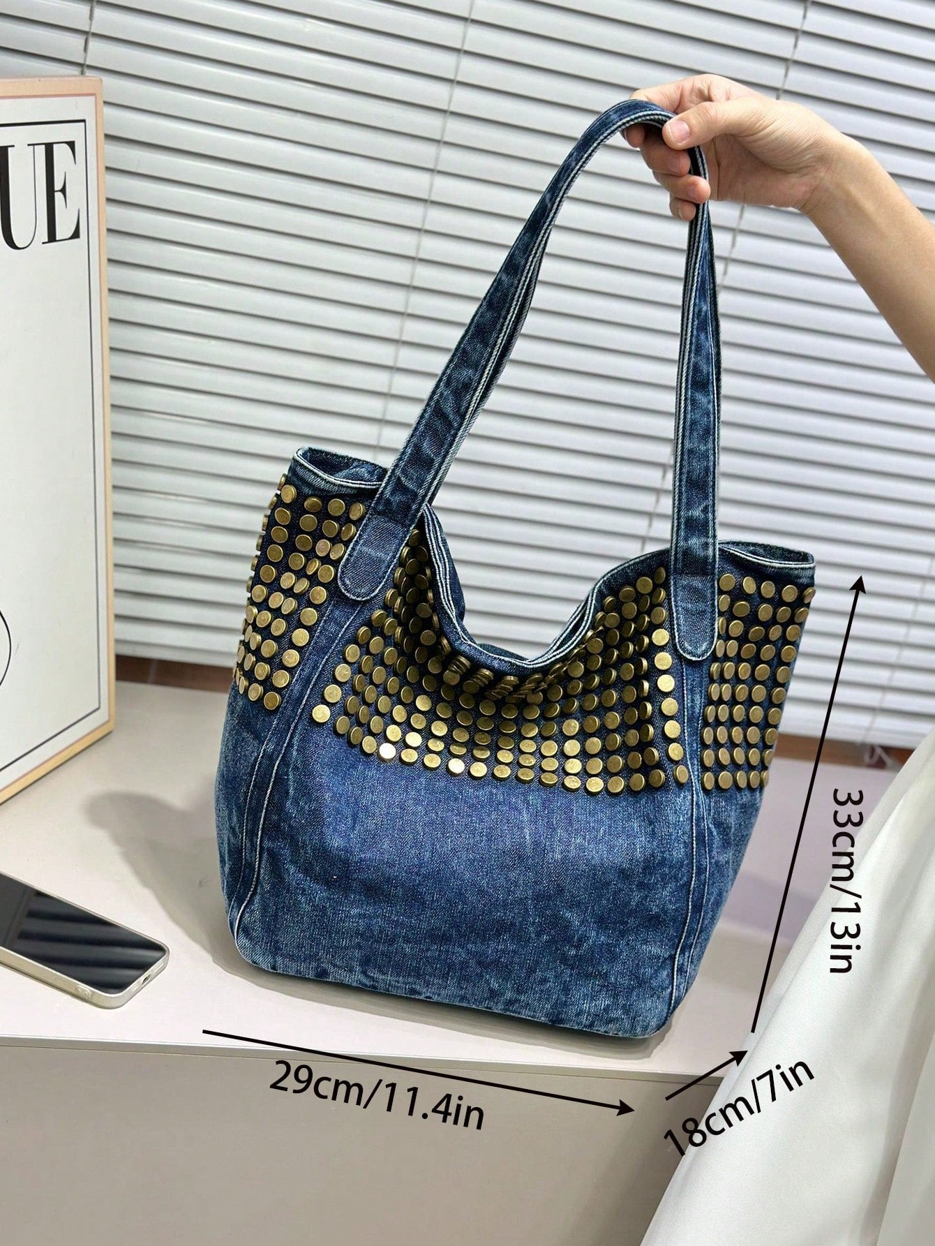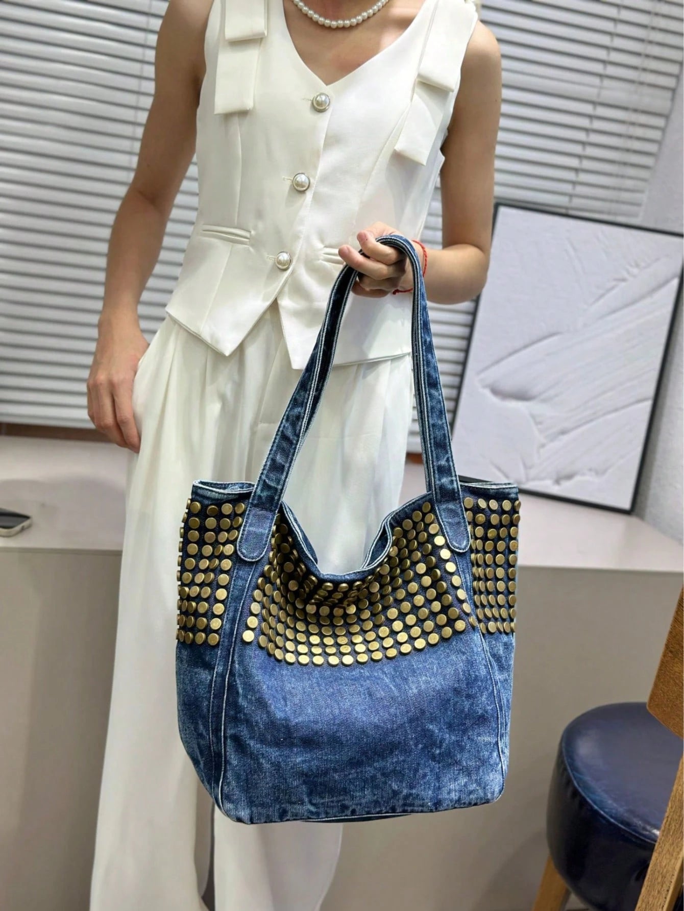 Soft Leather Tote Bag – Large Capacity, Rivet Design, Leopard Print-Baby Blue