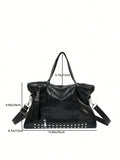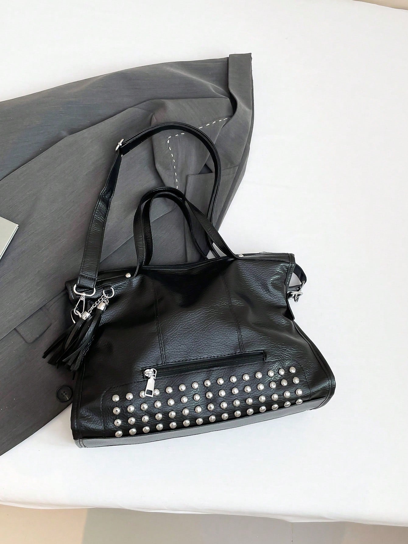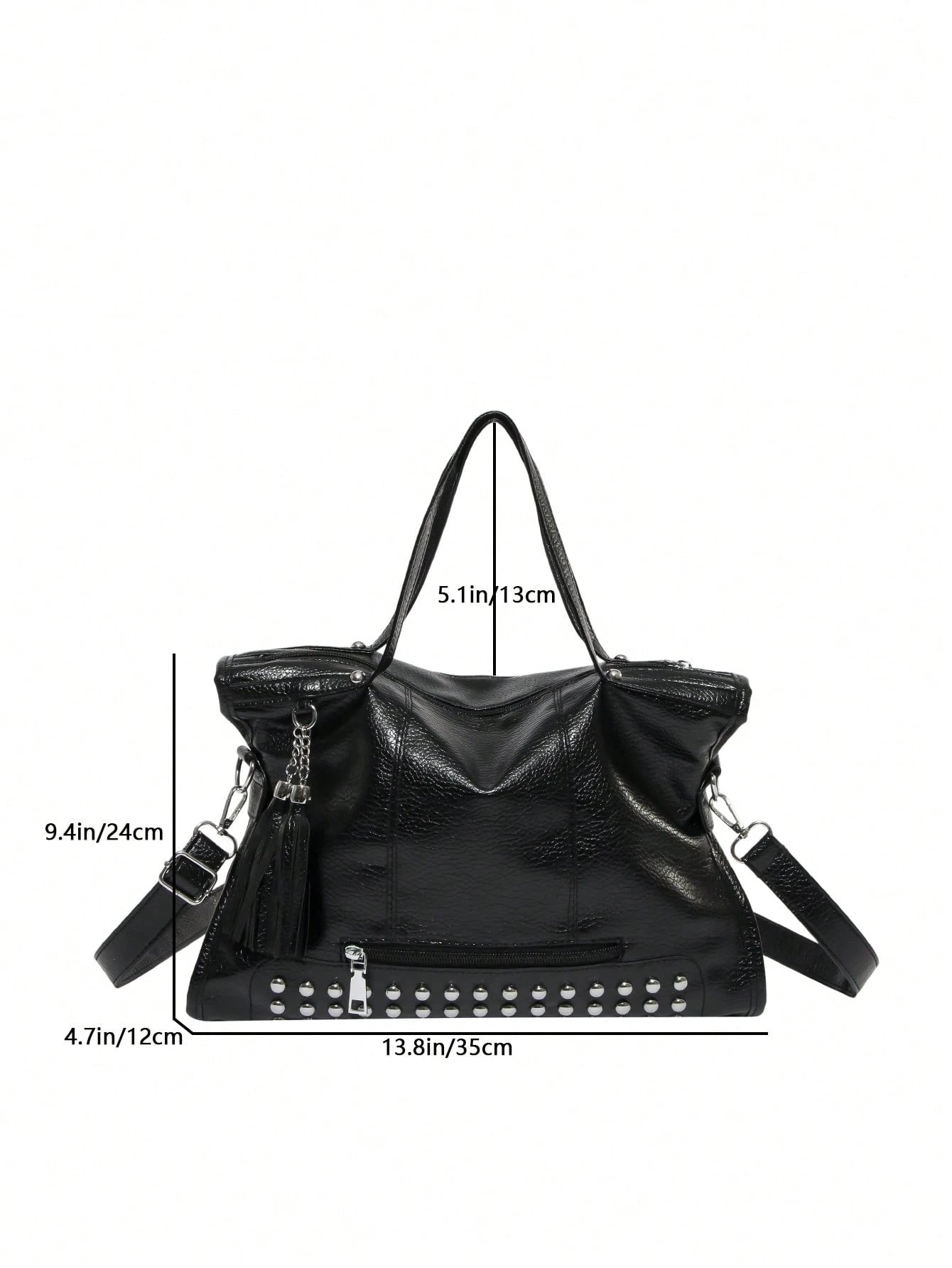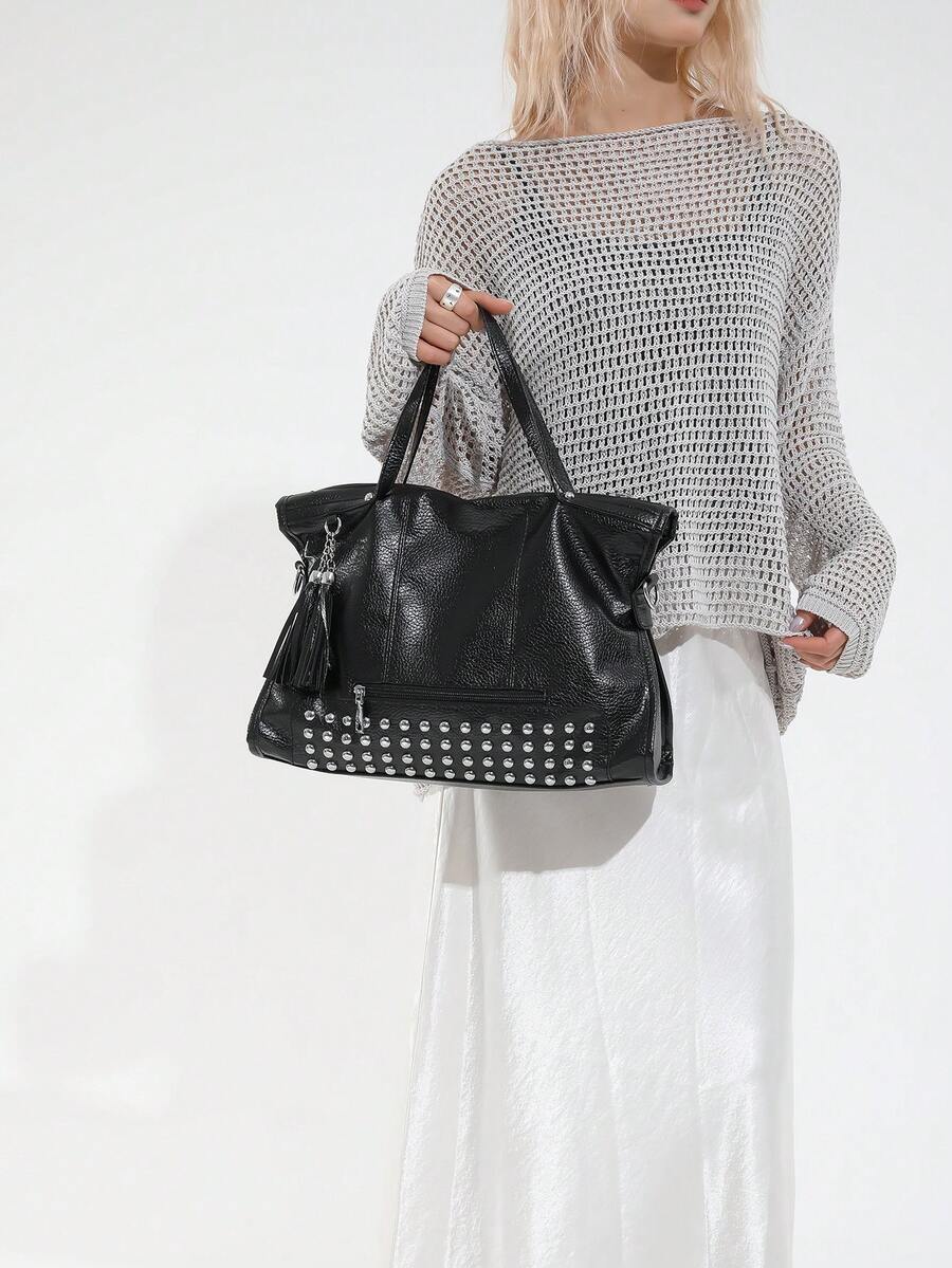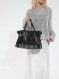 Soft Leather Tote Bag – Large Capacity, Rivet Design, Leopard Print-Black