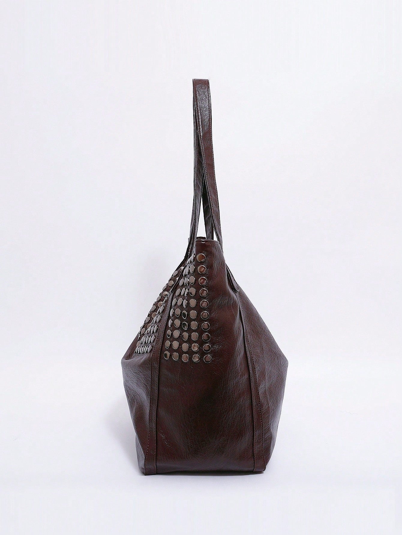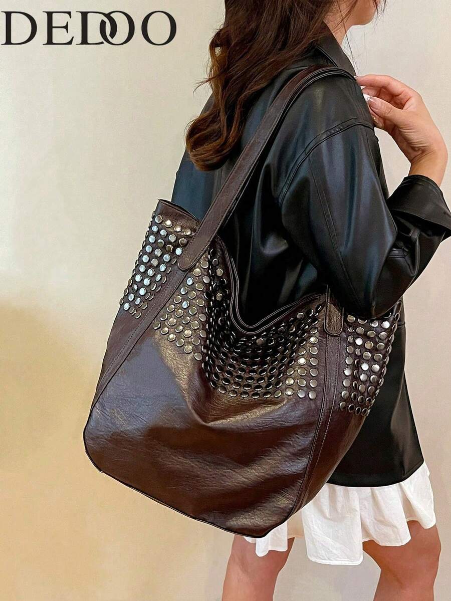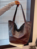 Soft Leather Tote Bag – Large Capacity, Rivet Design, Leopard Print-Coffee