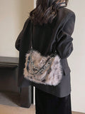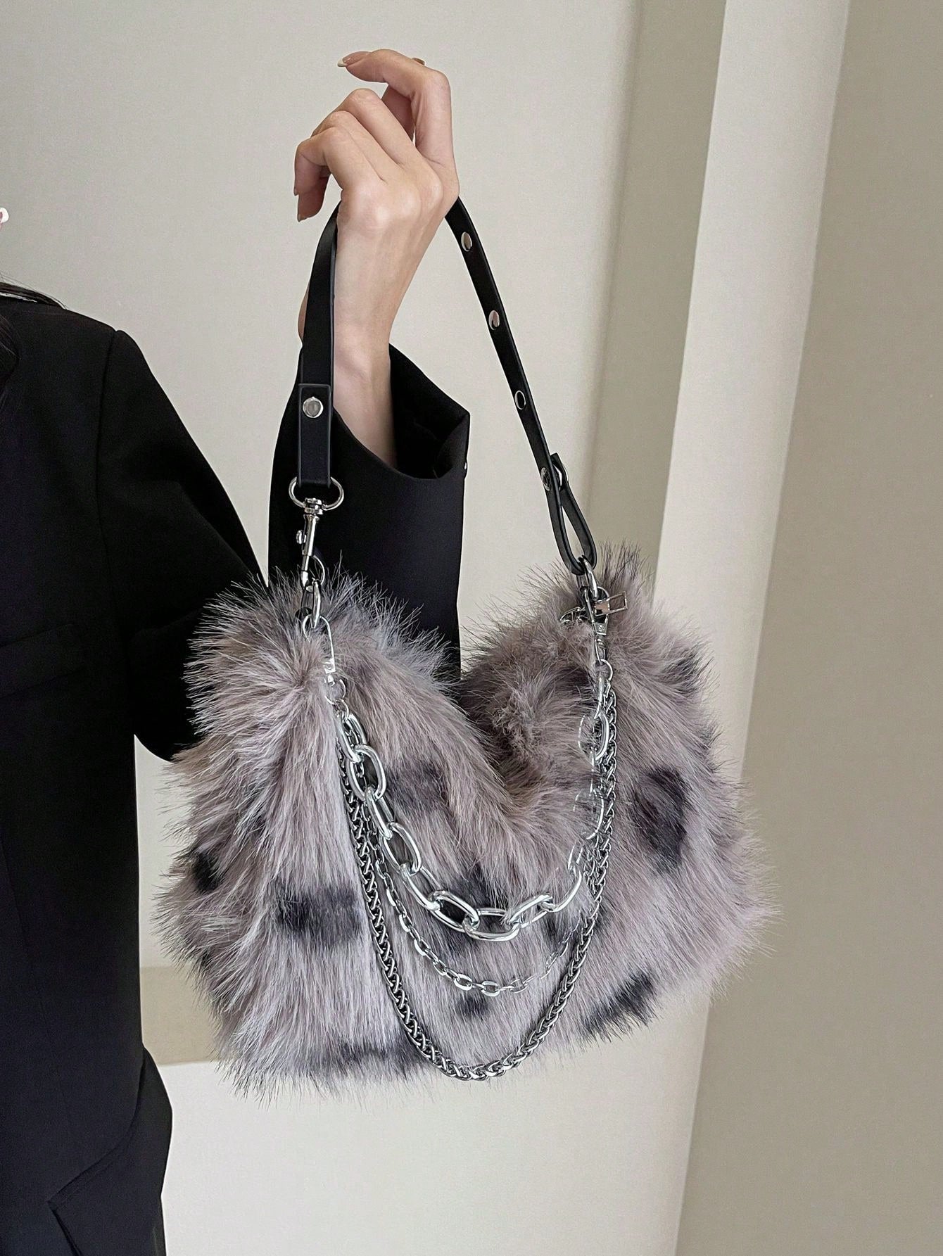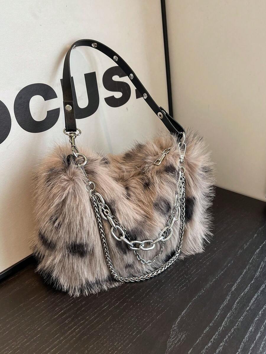 Women's Burgundy Leopard Spotted Faux Fur Shoulder Bag With Chain, Fashionable For Autumn/Winter-Grey