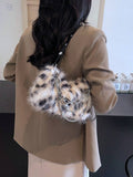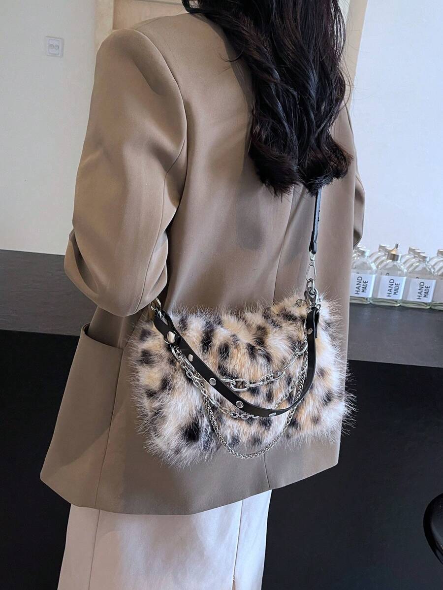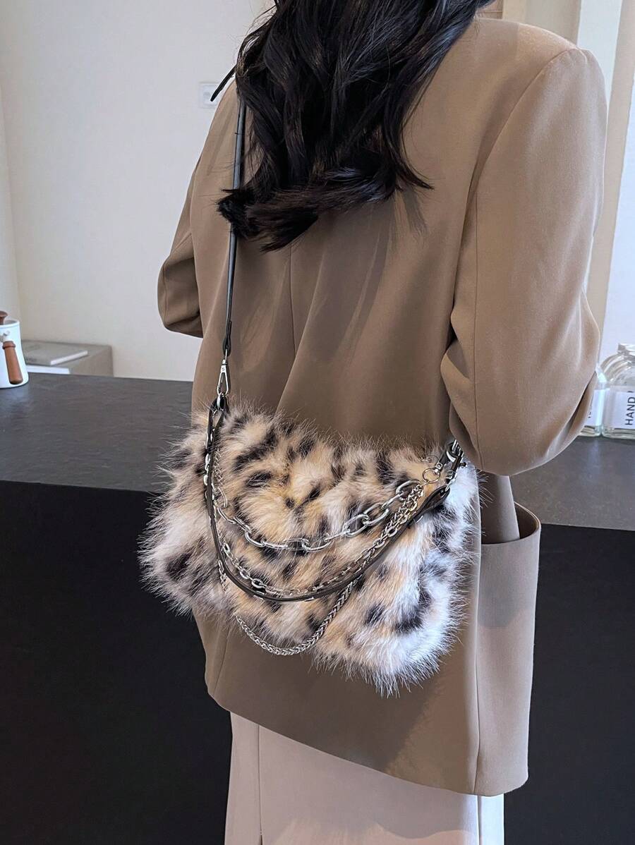 Women's Burgundy Leopard Spotted Faux Fur Shoulder Bag With Chain, Fashionable For Autumn/Winter-multicolor-2