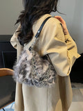 Women's Burgundy Leopard Spotted Faux Fur Shoulder Bag With Chain, Fashionable For Autumn/Winter-Grey